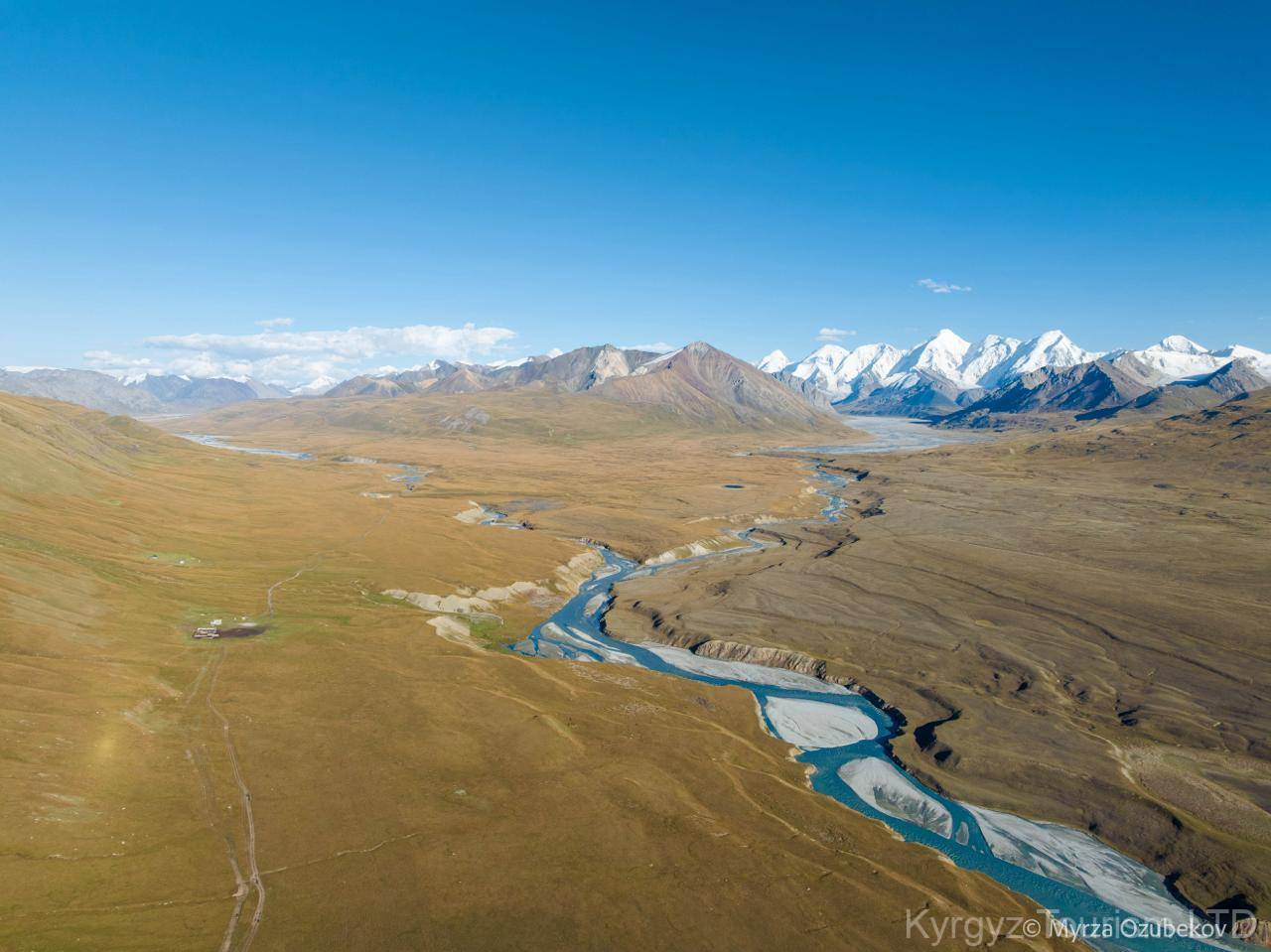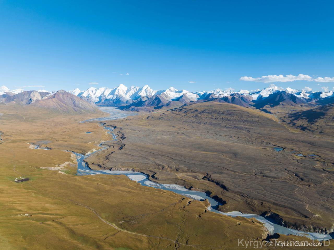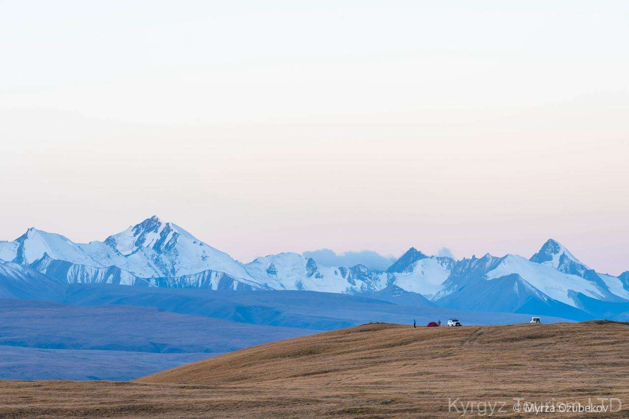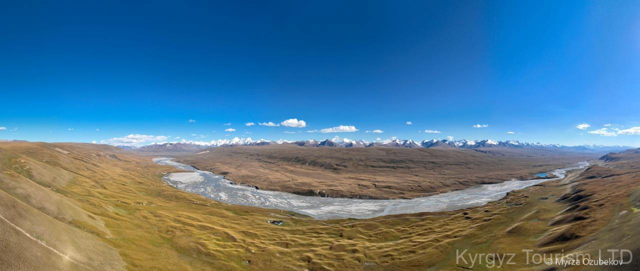 Highlight: Herbstlicher Kontrast zwischen schneebedeckten Gipfeln und goldener Steppe.